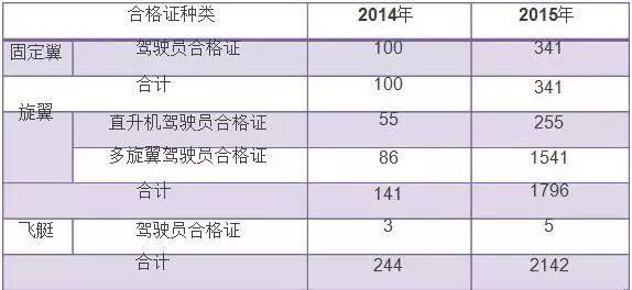 无人机驾驶员管理分为三类,分别是无需证照管理,由行业协会实施管理以及由局方实施管理。2014年,民航局委托中国私用航空器拥有者及驾驶员协会 (AOPA)负责为在视距内运行的空机重量大于7千克的无人机驾驶员以及在隔离空域超视距运行的无人机驾驶员颁发无人机驾驶员合格证。无人机驾驶员合格证 数量统计见下表: