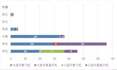 按照91部K章分类,航空器代管业务分为2种。一种是小型航空器代管,主要用于作业飞行;另一种是大型航空器代管业务,主要用于私用远途飞行。目前我国 从事航空器代管业务的公司27家,其中从事小型航空器代管业务的7家。从事大型航空器代管业务的20家。(注:中信海直通用航空有限责任公司既有大型代管 又有小型代管运行资质)。各地区通航公司代管业务统计如下图。